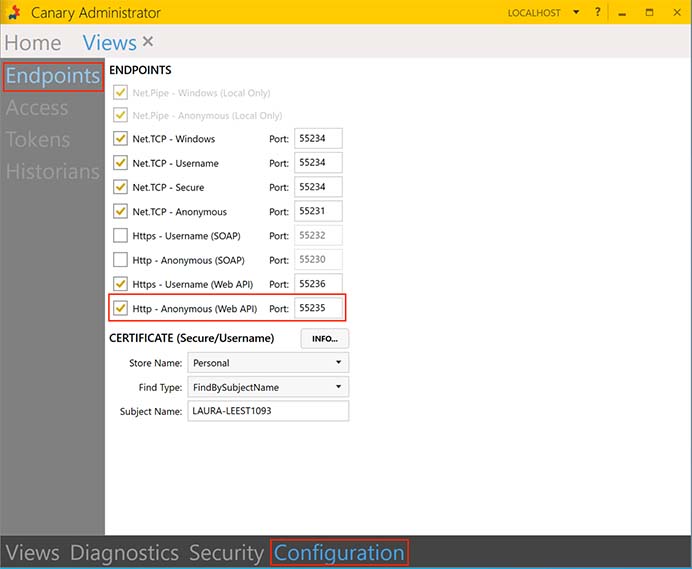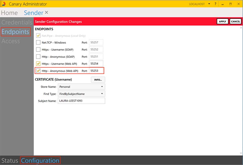 2. Use the “Configuration” menu at the bottom of the screen and open the “Endpoints” menu on the left-hand side. Click on “Https – Anonymous (Web API)” to enable it, and make sure it uses port 55253. Click on the “Apply” button at the top of the red bar to apply the changes