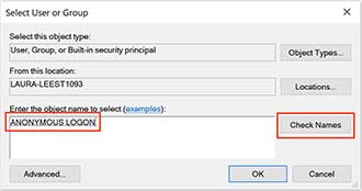 4. Add “Anonymous Logon” to the Allow window and click on the “Check Names” button. When the name is underlined, you can click on the “OK” button