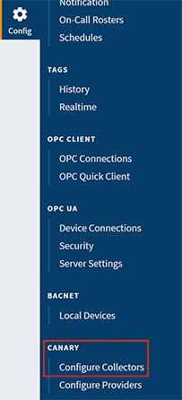 6. Navigate to the Ignition Gateway and open the Config menu like before. Scroll down until you find the “Configure Collectors” option under the “CANARY” heading