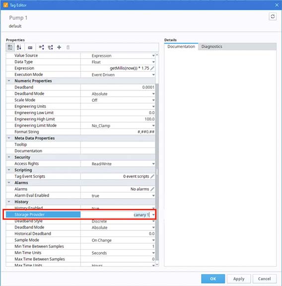 You can enable history for a tag and select he newly created Canary Collector as the Storage Provider. Since the module is built on top of Ignition’s Tag History Module you can take advantage of all the history settings that include deadbands, tag groups and min/max times between samples.
