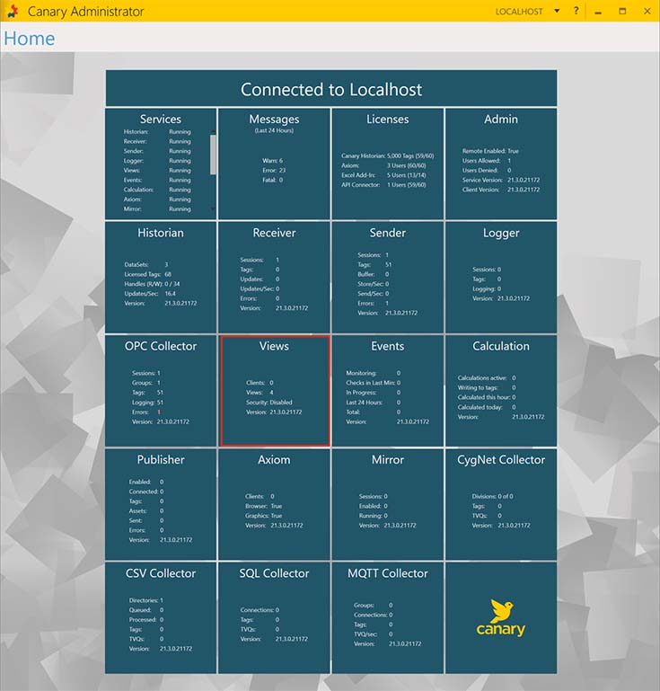 - Open the Canary Admin application on your Ignition Gateway and navigate to the Views tile