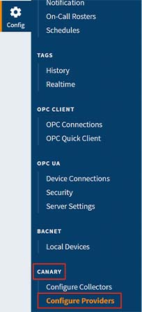 4. Navigate to the Ignition Gateway and open the Config menu like before. Scroll down until you find the “Configure Providers” option under the “CANARY” heading