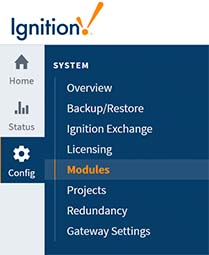 - Launch your Ignition Gateway. Navigate to the “Config” section and click on the “Modules” option. This is where you need to install the Canary module that you downloaded in the previous section.