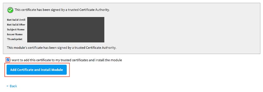4. You will be prompted with a confirmation screen that describes the modules’ certificate details. If you agree, tick the checkbox to agree and click on the “Add Certificate and Install Module” button